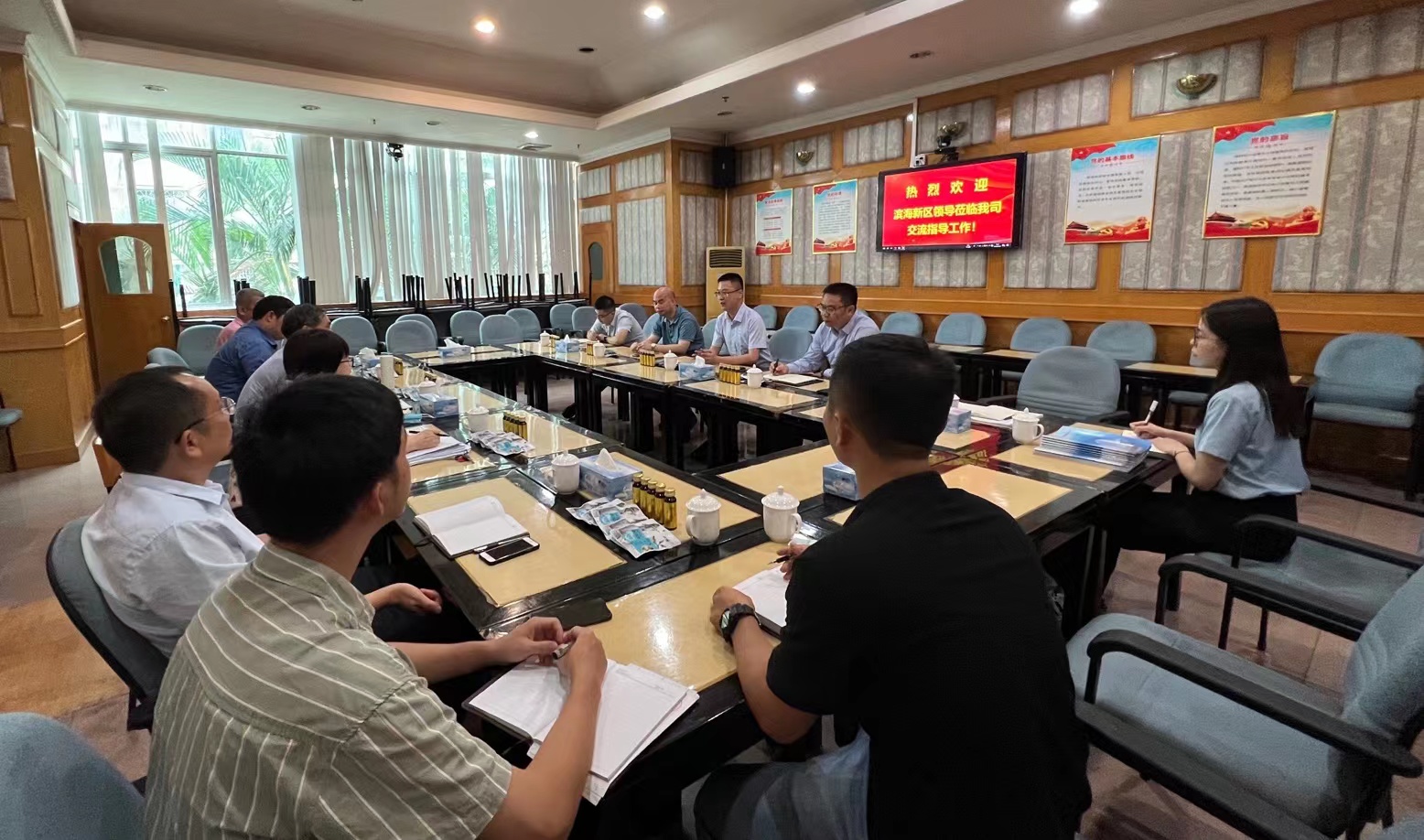 黃遠維詳細介紹了濱海發展集團的業務情況,認為雙方在油品貿易和綠色化工產業等領域有合作共贏的潛力,并對危化品運輸、成品油貿易和成衣清洗等業務進行了深入討論。