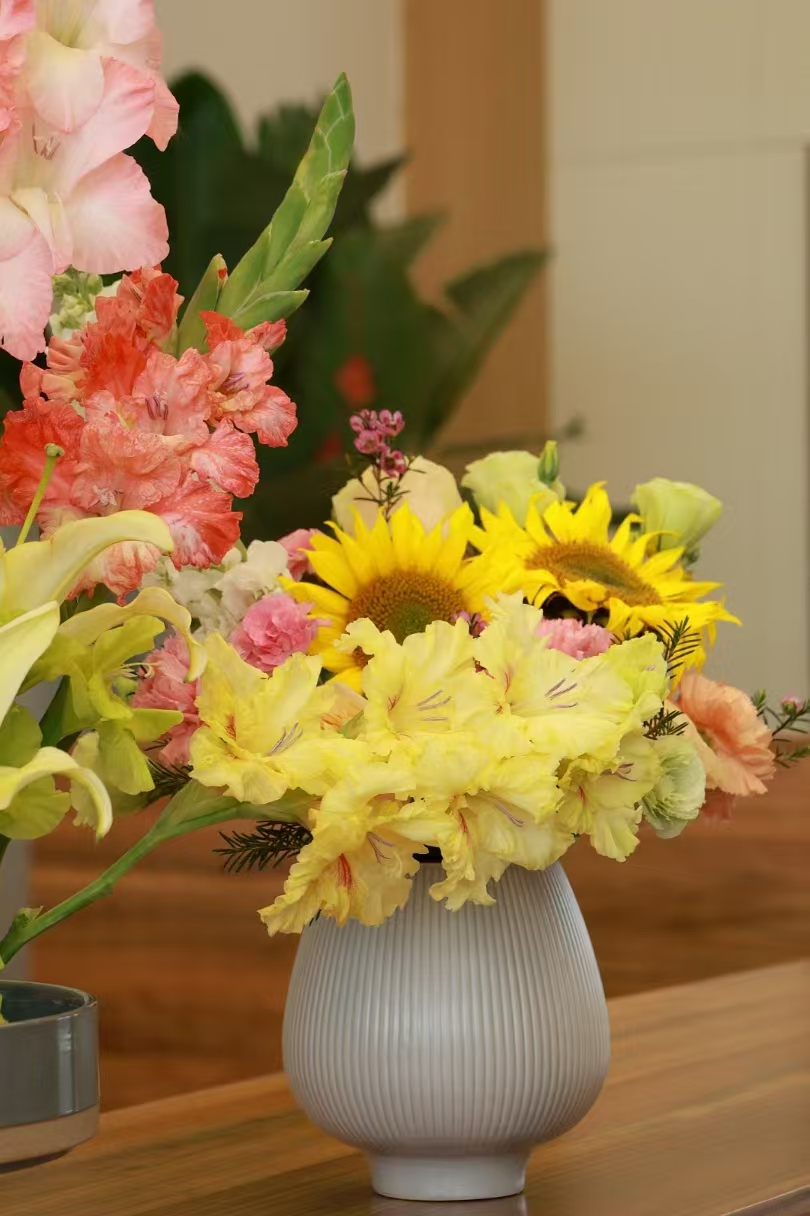 專業(yè)花藝師從色彩搭配、造型設(shè)計(jì)到花材養(yǎng)護(hù)展開生動(dòng)講解,將插花藝術(shù)與生活美學(xué)娓娓道來(lái)。女職工們化身“春日造夢(mèng)師”,修枝剪葉、構(gòu)思層次,指尖流轉(zhuǎn)間,原本零散的花材逐漸煥發(fā)新生。有人將玫瑰與康乃馨編織成古典花甕,盡顯端莊大氣;有人以向日葵搭配綠植打造田園風(fēng)花籃,充滿生機(jī)活力。現(xiàn)場(chǎng)歡聲笑語(yǔ)不斷,四十余件作品或清雅秀麗,或熱烈奔放,宛若一首首無(wú)聲的春日詩(shī)篇。